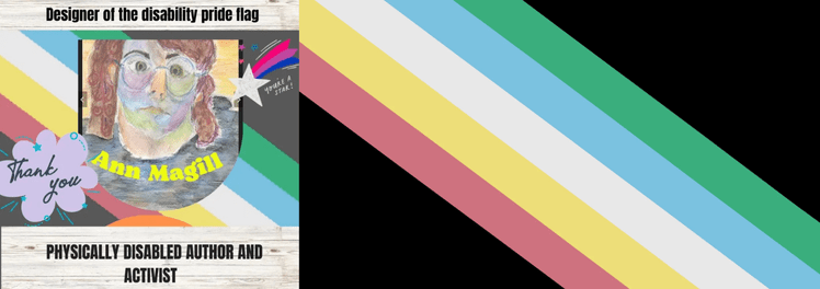 In 2016 Ann was “driven to design an actual flag, instead of just wishing we had one.” Disability pride was her answer when a terrorist murdered disabled people in a hate crime in Japan. In his manifesto he said we needed to be euthanised for the sake of the country and world peace.